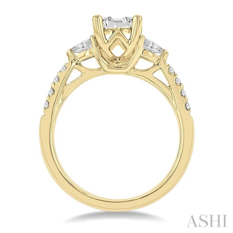 A gorgeous fusion of three diamond cuts is visible in this decorative and stylish engagement ring. It features a raised emerald center mount that houses 3 invisible set baguette diamonds, lying vertically in the center, with an invisible set baguette diamond each flanking the center baguette at the top and bottom. 4 prong set round cut diamonds, one each in every corner, fill the center mount. On a lower border, flanking the center mount, is a pear shape mount each, embellished with a prong set pear cut diamond each. Adorning the shank on either side is another 4 each, total 8, micro wall set round cut diamonds. The engagement ring is styled in a polished rhodium finish 14 karat yellow and white gold. Total diamond weight is 3/4 Ctw.