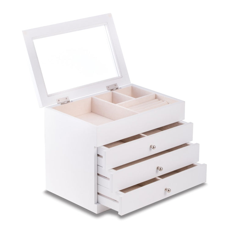White Finish Solid Wood Velour Lined Clear Lid 3-Drawer Jewelry Box