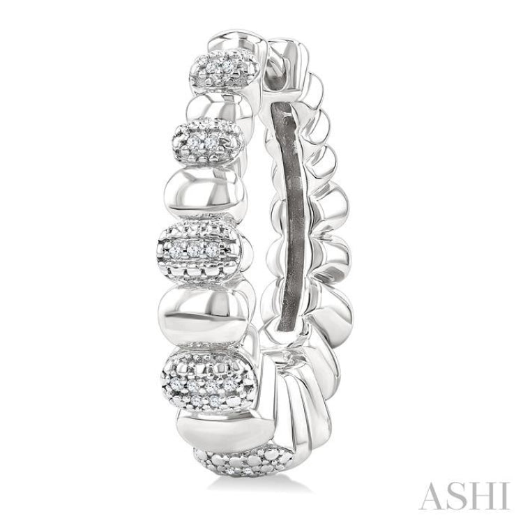 A captivating blend of bold design and refined sparkle, these diamond fashion hoop earrings exude modern elegance. Graduated oval-shaped ball bead accents create a striking silhouette, with smaller beads at the top gracefully increasing in size toward the base. Alternating between plain silver and diamond-adorned beads, the hoops shimmer with dimension and contrast. A total of 30 prong hand set single cut diamonds illuminate the hoop front, adding a radiant touch to the sculptural form. Secured with a single notch post, these bold diamond fashion hoops are crafted in rhodium-finished silver for a sleek and sophisticated finish. Total diamond weight is 1/10 Ctw.